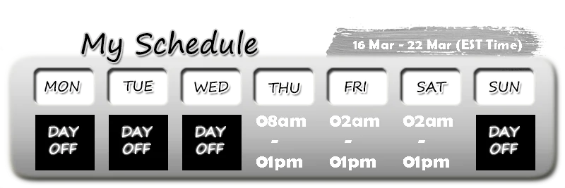 Palenie, Masturbacja, Elastycznie, Na pieska, Palcówka, Orgazm, Twerking, Ejakulacja, Fetysz stóp, Lush control, Sprośne słówka, Masturbacja, Striptiz, Taniec erotyczny, Pokaz w oliwie, Klapsy, Zabawki analne, Dildo lub wibrator, Dildo show (Pvt + 1000Tkn), Poniżenie, Zabawki, Robienie loda, Głębokie gardło, Masaż, Kneblowanie, Pierścień na penisa, CEI, SPH